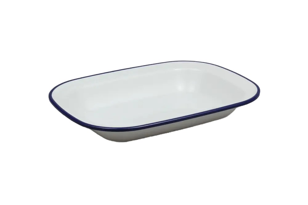 כלי הגשה מלבני דמוי אמייל 27*20 לבן פס כחול מלמין***2205111